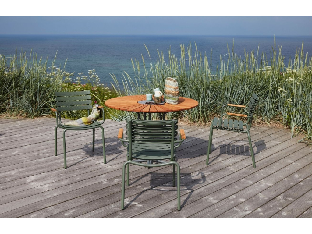 Zahradní židle HOUE ReClips zaujme svým moderním vzhledem v severském stylu. Její sedák je vyrobený z plastových lamel z recyklovaného plastu a podnož z lakovaného hliníku. Společně vypadají skvěle a vytvářejí unikátní kousek nábytku, který je navíc velice pohodlný. Područky z přírodně zbarveného bambusového dřeva dodávají židli šmrnc. Židle je vhodná do interiérového i exteriérového prostředí.