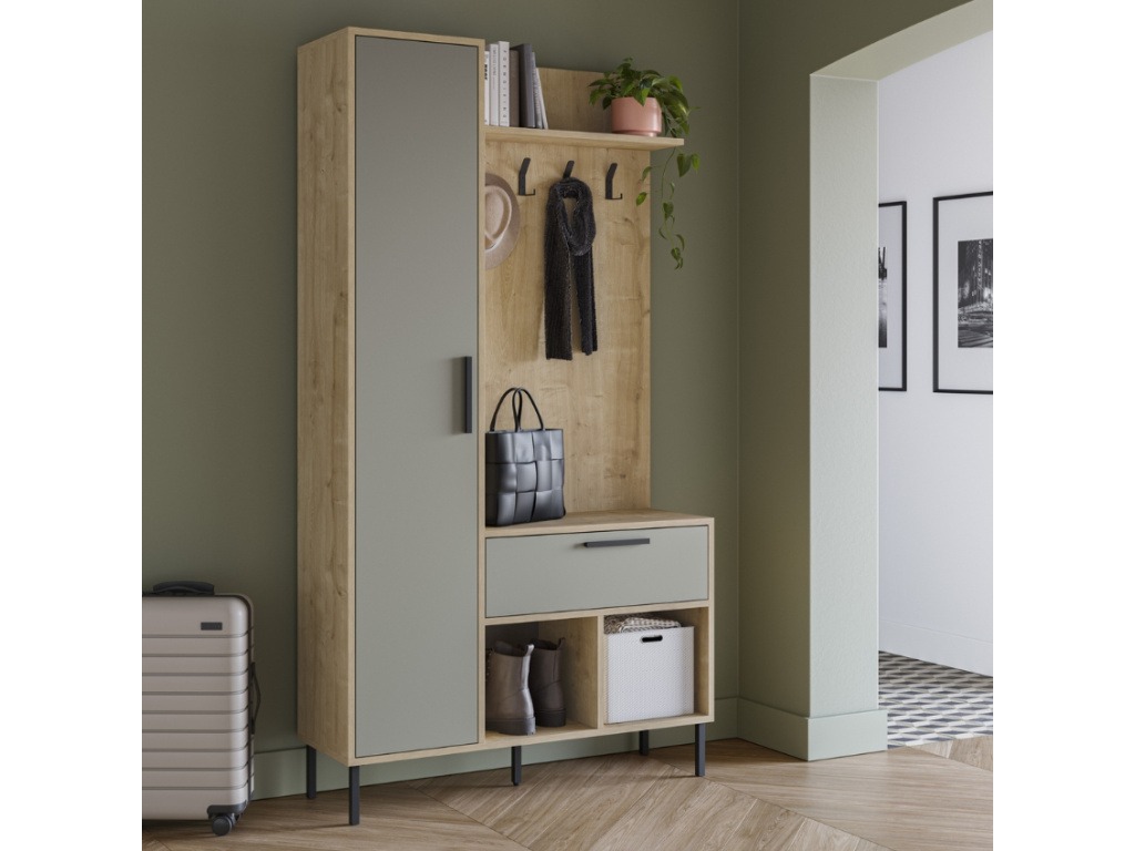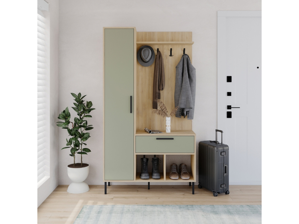 Předsíňová stěna Heidy v kombinaci zeleně lakovaného laminátu a dubového dekoru vnese do interiéru příjemnou atmosféru. Nabízí chytré řešení pro uložení obuvi, kabátů i drobností díky uzavíratelné skříňce s třemi policemi, zásuvce a otevřeným přihrádkám. Kovová podnož a černé úchytky podtrhují moderní charakter nábytku. Tento model je k dispozici také v elegantní krémové variantě.