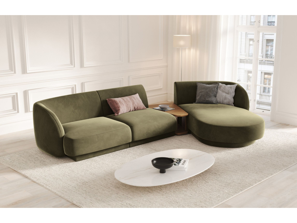 Trojmístnou rohovou pohovku Miley od značky Micadoni si zamilujete! Její obloukovitě tvarované opěradlo vybízí k tomu, abyste se na chvíli pohodlně usadili. Mírně zapuštěná základna dodává sezení vznášející se charakter, který dotváří vzhled připomínající oblak. Měkký, odolný a na pohled příjemný samet poskytuje nábytku lákavý vzhled, který vnese do místnosti záři a pocit sofistikovanosti. Pohovka je ideální volbou do interiéru v moderním nebo skandinávském stylu. K pohovce je možné přikoupit další produkty z kolekce Miley. Díky tomu si můžete vytvořit sedací soupravu, kterou je vhodné kombinovat se skleněným nebo dřevěným konferenčním stolkem.
