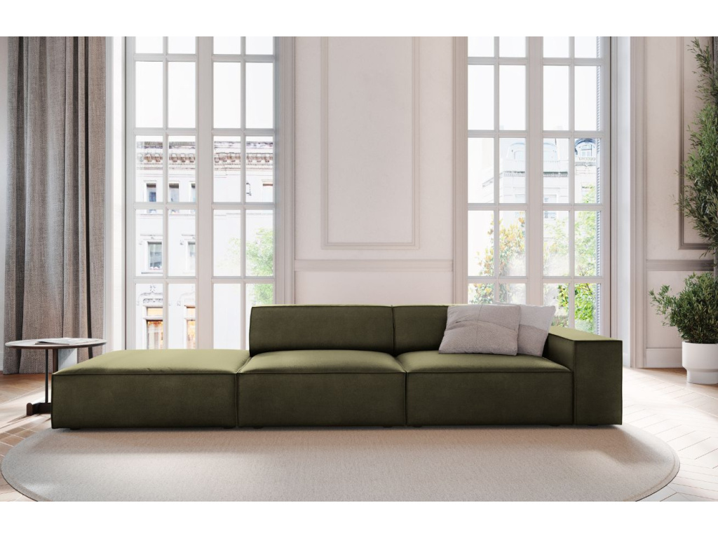 Prostorná modulární trojmístná pohovka Jodie od značky Micadoni zaujme svou krásnou siluetou. Čalounění je vyrobené z tkaniny, která imituje samet s jemným leskem. Látka se vyznačuje dobrou odolností proti oděru, což výrazně snižuje riziko jejího poškození, také prošla testem na cigarety, díky tomu je pohovka vhodná i do komerčních prostor. Její polstrovaný tvar vám zaručí plnohodnotný odpočinek, zatímco hluboký sedák umožní dokonalou relaxaci. Opřít se můžete také o tvarované opěráky a široké područky, které vybízejí k nespoutanému lenošení. Nízká podnož ladí s útulnou siluetou nábytku. Velký výběr modulů vám umožní vytvořit si kombinace, které budou nejlépe vyhovovat vašemu obývacímu pokoji v minimalistickém či skandinávském stylu.