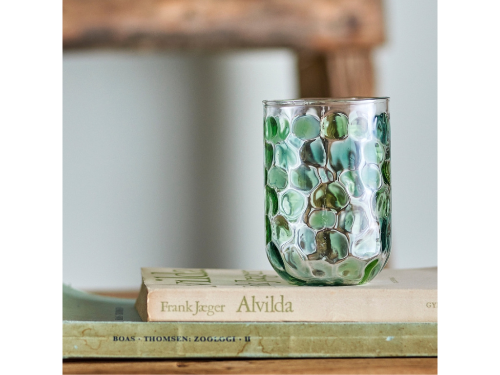 Sklenice Rondha od značky Bloomingville vytváří ústřední bod svými krásnými skleněnými kapičkami a zelenou proměnlivou hrou barev – od světle zelené po tmavě zelenou. Sklenice je foukaná ústy a kapičky jsou ručně vyráběné, proto v designu mohou být malé odchylky. Sklenici lze využít jak originální dekoraci, tak jako nádobu na oblíbené nápoje.