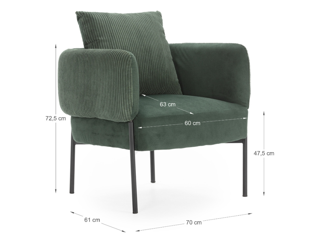 Křeslo Aruni v elegantní zelené barvě přinese do vašeho domova svěží energii a nadčasový styl. Manšestrové čalounění s jemnou žebrovanou strukturou působí hřejivě a příjemně na dotek. Měkké polstrování a pohodlný opěrný polštář lákají k odpočinku po celý den. Stylový kousek, který zaujme nejen vzhledem, ale i komfortem! K dostání je hned ve čtyřech trendy barvách.