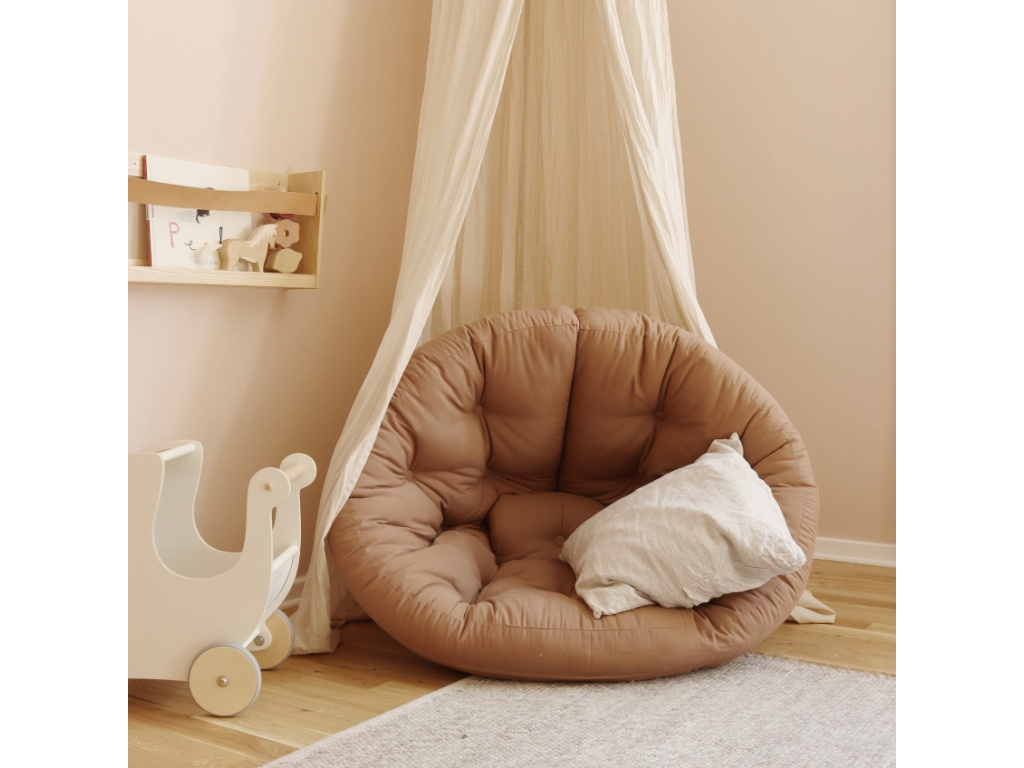 Křeslo Nido nabízí útulné zákoutí, kde si můžete užívat zasloužený odpočinek po náročném dni. Po rozepnutí čtyř popruhů na suchý zip, které se nacházejí na zadní straně, se z křesla stane půlměsícové lůžko, které vám poslouží jako místo na hraní, zdřímnutí nebo meditaci. Pokud vlastníte křesla dvě, můžete tyto lůžka pomocí pásků spojit a vytvořit z nich tak příjemnou kulatou postel pro hosty. Futonové křeslo se pyšní kvalitním 80% bavlněným čalouněním, které je plněné pěnou z recyklovaných vláken. Nido se skvěle hodí do skandinávsky laděných domovů a fantasticky zapadne do obývacích pokojů, ložnic či dětských pokojů. Vybrat si můžete z široké škály barev, které si pro vás připravili designéři A. Backe, A. S. Voss, I. S. Lange, L. Wigh, T. R. Pedersen. Křeslo dozdobte například jemným baldachýnem –  fantasticky ho doplní.