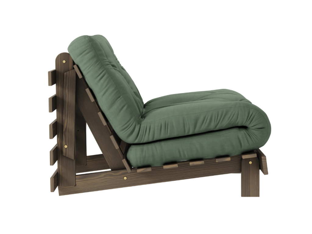 Rozkládací křeslo Roots od značky Karup Design se rychle stane vaším oblíbeným společníkem při chvilkách odpočinku. Elegantní a stylové křeslo proměníte jednoduchým pohybem na praktické a pohodlné lůžko. Konstrukce z hnědého masivního borovicového dřeva s FSC certifikací je doplněna kvalitní 12 cm vysokou futonovou matrací, která v sobě kombinuje recyklovaná vlákna a 4 cm pěnu. Křeslo Roots skvěle doplní skandinávsky a minimalisticky laděné domovy. Ideální je například pro menší interiéry, kde oceníte další místo na spaní. Vybrat si ho můžete v široké škále barev.