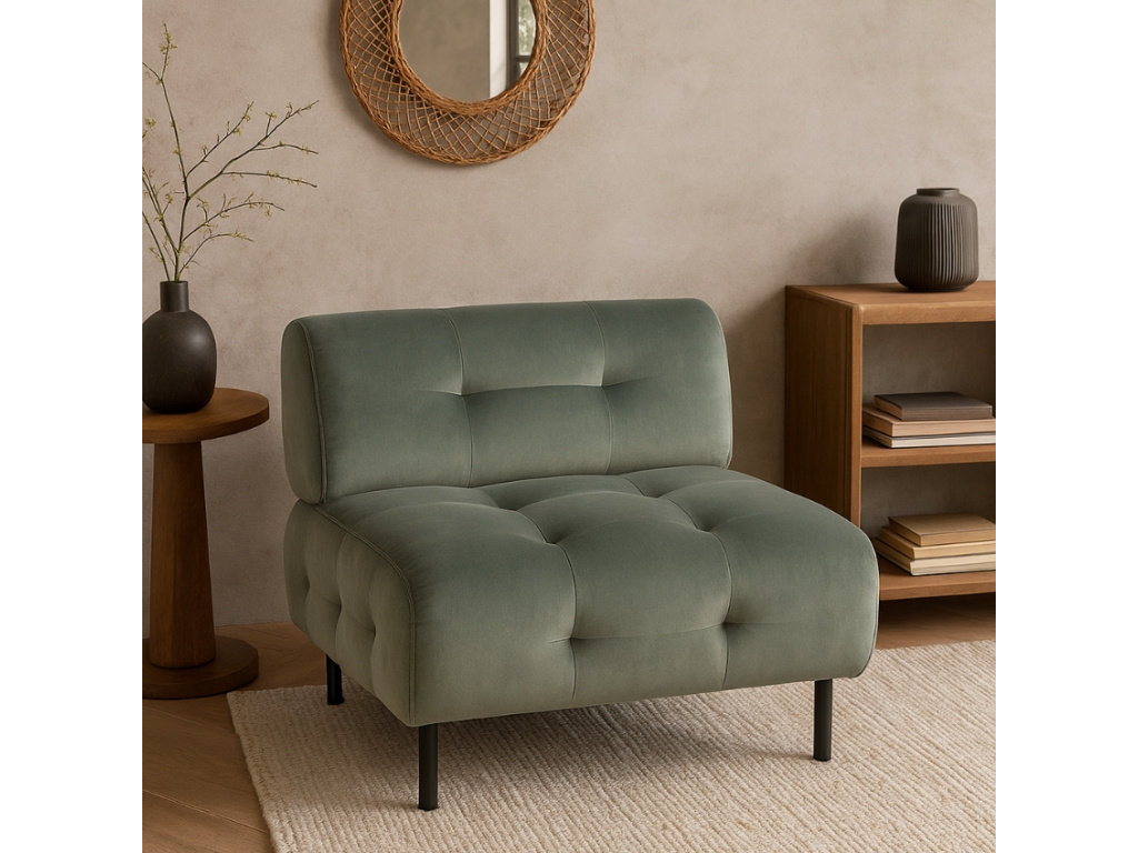 Pohodlné křeslo bez područek Doyle vás zaujme originálním křížkovým prošíváním, které mu dodává elegantní vzhled. Kvalitní sametové čalounění je nejen velice odolné, ale hlavně pohodlné a příjemné na dotek. Křeslo bude vypadat skvěle samostatně i společně s pohovkou nebo podnožkou ze stejnojmenné série.