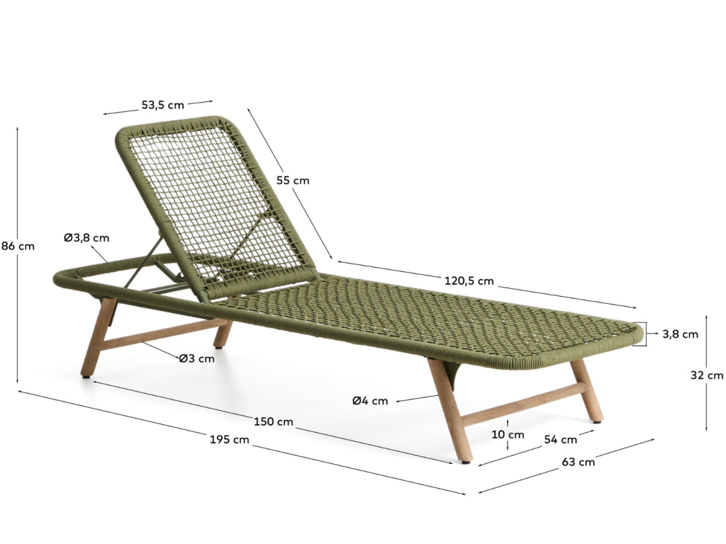 Série zahradního nábytku Kave Home Dandara dodá každému venkovnímu posezení eleganci a styl – tyto designové kousky rozhodně neuniknou pozornosti žádné vaší návštěvy. Najdete v ní lehátka, stolky i židle, takže celý prostor může být dokonale sladěn. Zahradní lehátko se pyšní bytelnou ocelovou konstrukcí s akátovou podnoží a sedákem z lanového výpletu. Akátové dřevo je opatřeno certifikací FSC, což znamená, že pochází z udržitelně a zodpovědně obhospodařovaných lesů. Díky 3 nastavitelným polohám opěradla lehátko lehce přizpůsobíte vašim potřebám, ať už čtete knížku nebo si chcete zdřímnout. Doplňte lehátko například o zahradní stolek, kam můžete odložit svůj oblíbený drink. Lehátko je k dispozici také v dalších barevných provedeních.
