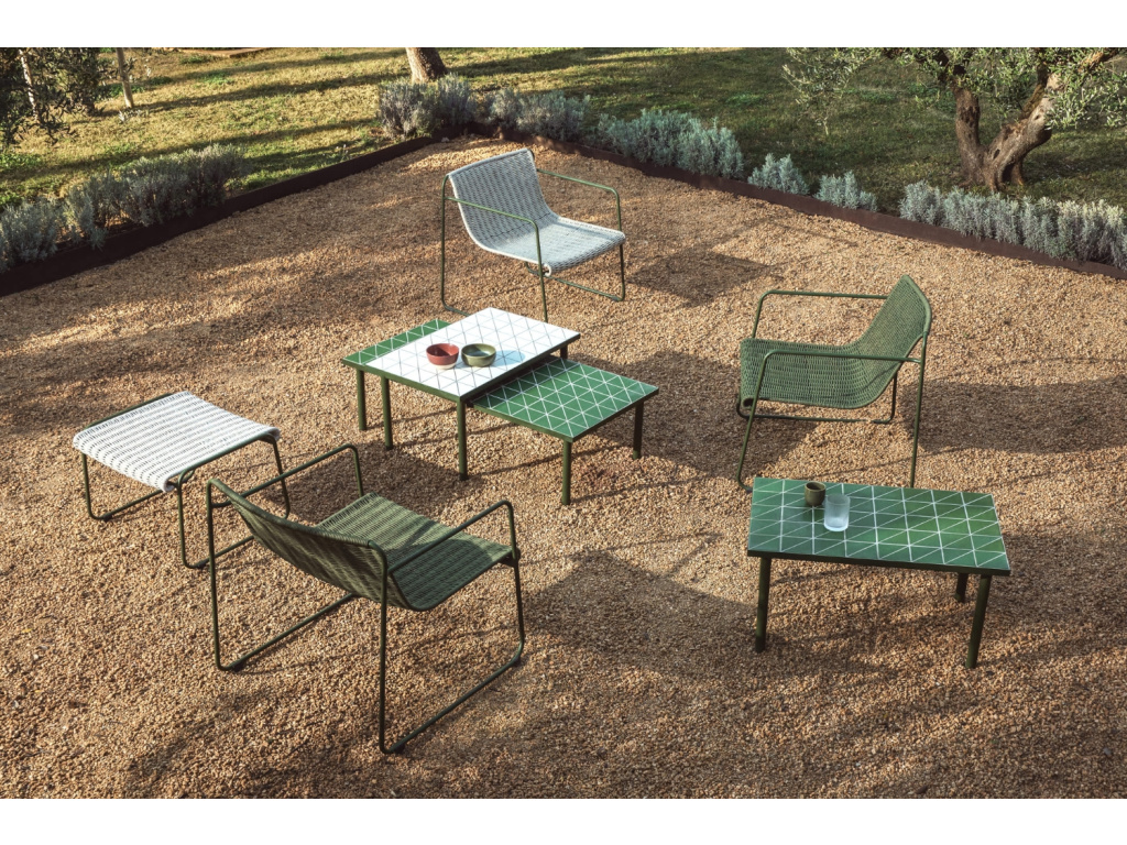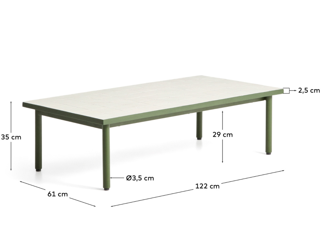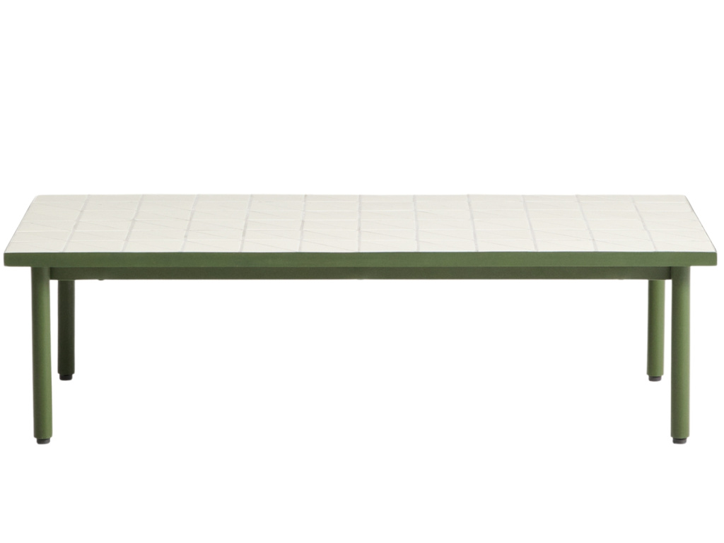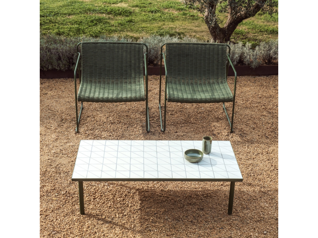 Zahradní konferenční stolek Maurina vnese do vašeho odpočinkového koutu sofistikovanou harmonii tradičního řemesla a moderního designu. Dominantním prvkem je jeho obdélníková deska s precizní bílou mozaikou, která skládá hold středomořské estetice v osvěžujícím geometrickém pojetí. Subtilní podnož z pozinkované oceli v elegantním zeleném laku zajišťuje vysokou stabilitu a odolnost vůči povětrnostním vlivům, zatímco plastové chrániče nohou citlivě pečují o povrch vaší terasy i interiéru.