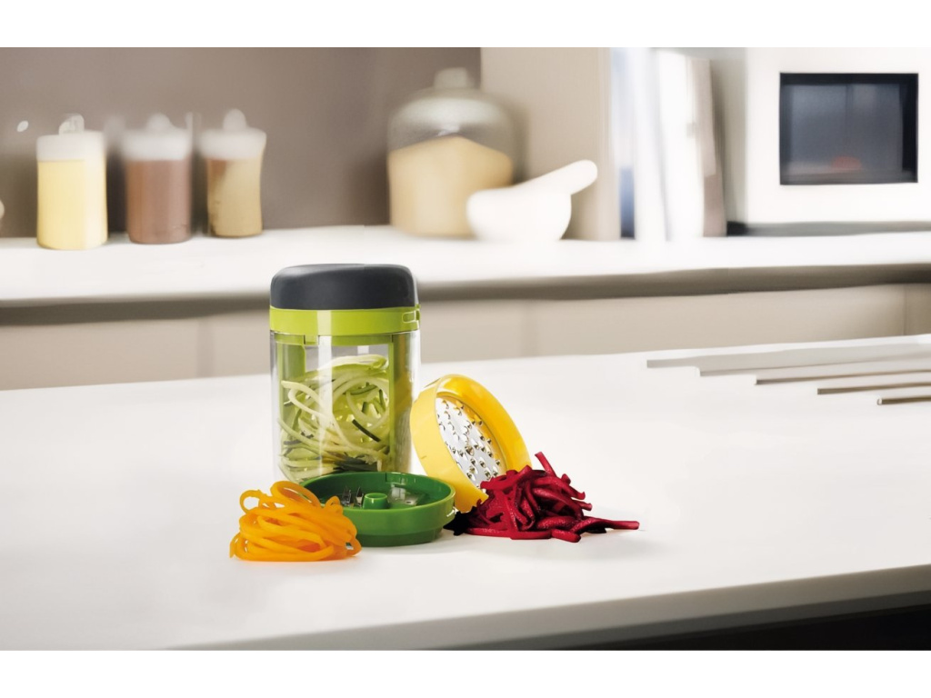 Ulehčete si přípravu zeleniny s příručním kráječem Spiro od značky Joseph Joseph! Ten vám během chvilky pomůže s přípravou zeleninových či ovocných nudliček a spirál do salátu i dalších oblíbených jídel. Lehká plastová konstrukce je snadno uchopitelná a vy otáčivým pohybem snadno nastrouháte nudličky, které se pak shromažďují ve spodní nádobce. Kráječ obsahuje celkem tři druhy struhadel – hrubé, jemné a struhadlo na tvrdý sýr.