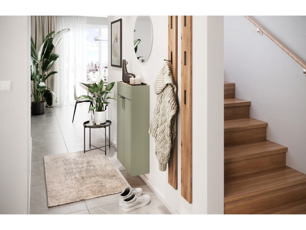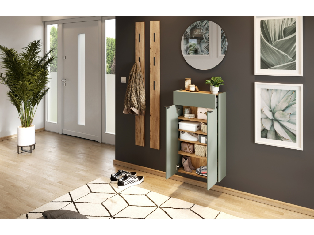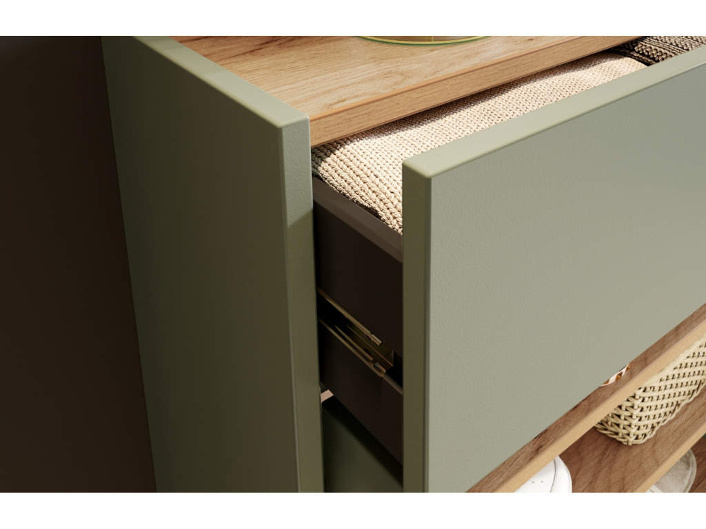 Stylový botník Ameca zaujme už na první pohled. Korpus z laminátu v příjemné zelené barvě přinese do vaší předsíně nebo chodby styl a nadčasovost. Minimalistický design botníku doplňuje horní deska v dekoru dubu a kovové úchytky. Do botníku se pohodlně vejde 10 párů bot. Botník se díky své velikosti hodí především do menších interiérů, kde se stane skutečným pomocníkem.
