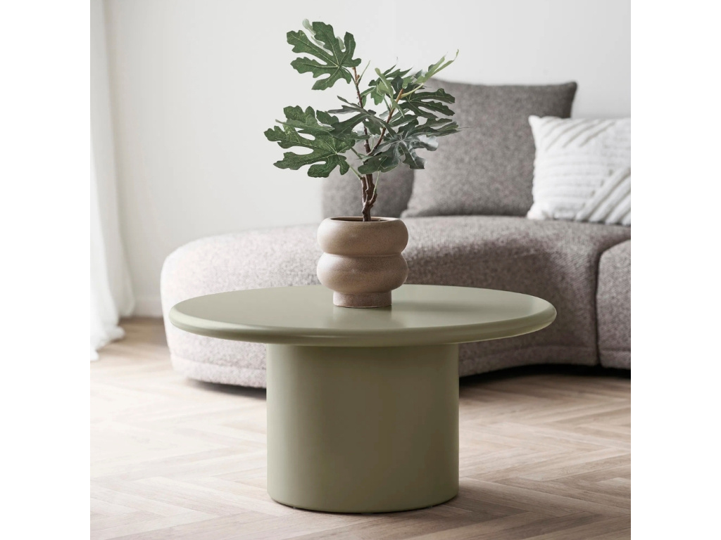 Konferenční stolek Nagato okamžitě zaujme svým sochařským vzhledem a dokonale čistými liniemi, které vnášejí do prostoru nádech moderní elegance. Jeho kulatá deska spočívá na robustní válcovité podnoži, která stolu dodává stabilitu a zároveň působí jako výrazný designový prvek. Díky matnému povrchu v tlumeném olivově zeleném odstínu působí stolek klidně a harmonicky, čímž pomáhá vytvářet uvolněnou atmosféru v obývacím pokoji. Minimalistické provedení bez zbytečných detailů podporuje vizuální čistotu interiéru a umožňuje snadné sladění s ostatním nábytkem. Stolek se výborně hodí do moderního, industriálního nebo urban boho stylu, kde vynikne jeho nadčasový charakter. Tento kousek promění každé posezení na stylový a komfortní zážitek.
