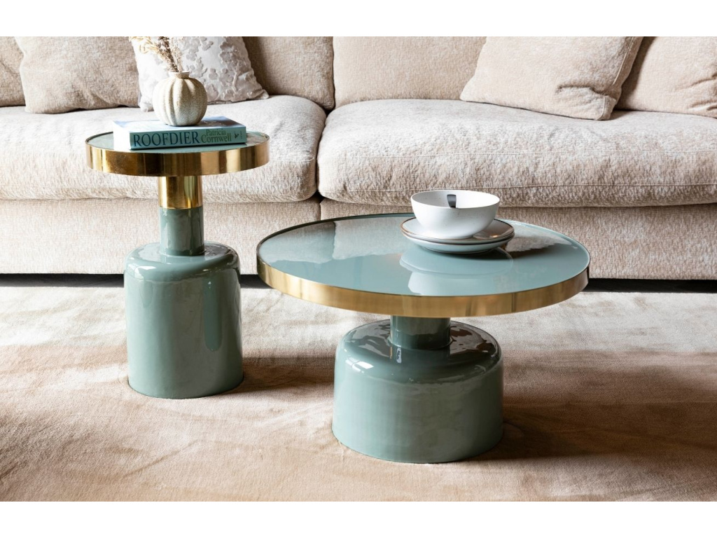 Designový konferenční stolek ZUIVER GLAM zaujme na první pohled svým jedinečným tvarem a unikátním zeleným zbarvením. Konferenční stolek skvěle padne do každého luxusního interiéru. Tento unikátní kovový stolek se skládá z horní kruhové části se stylovým zlatým lemováním a originální zaoblené mohutné podnože. Svými rozměry se hodí ke každé designové pohovce. Doporučujeme zakoupit spolu s neméně odkládacím stolkem stejného designu a barvy.