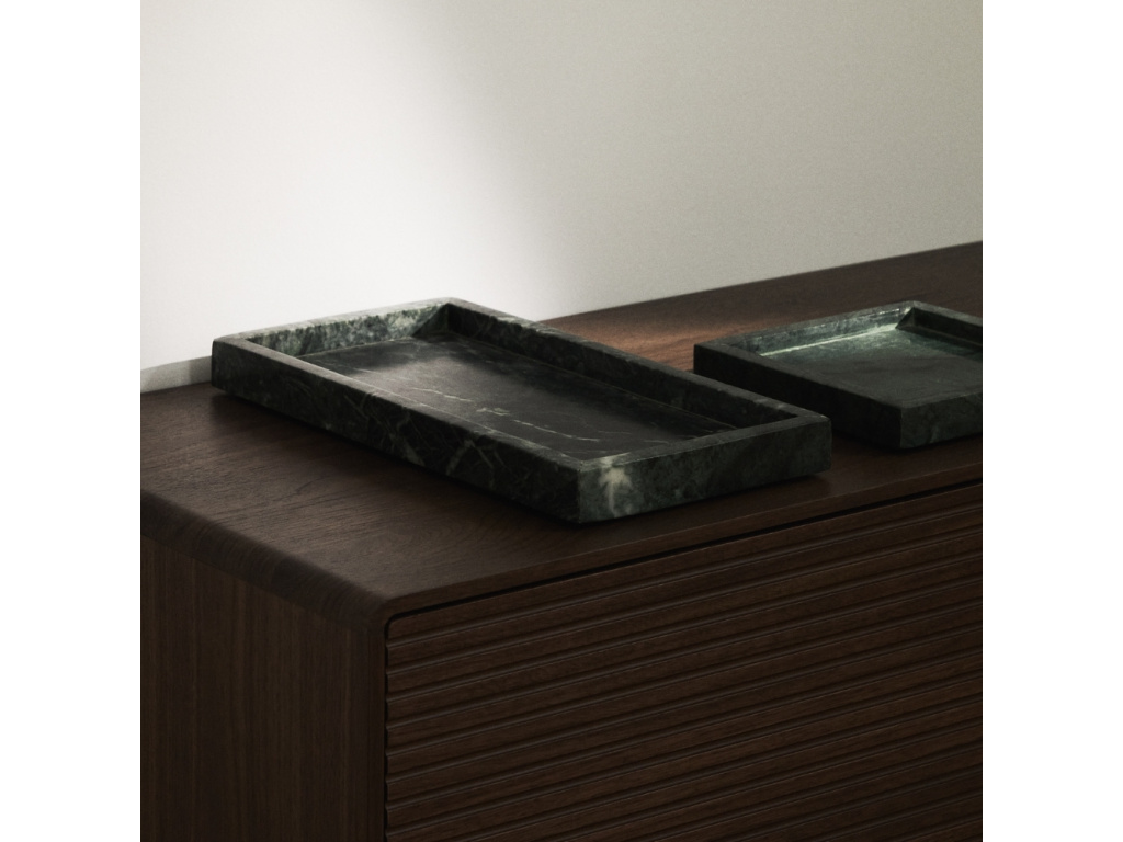 Tác Serela je důkazem, že i malý prvek může vytvořit velký moment. Vyrobený z přírodního mramoru, jehož přirozené žilkování dává každému kusu neopakovatelný charakter a vnese do interiéru nádech luxusu. Série nabízí více velikostí a dvě barevné varianty – bílý mramor pro svěží, minimalistický vzhled a zelený pro výraznější, luxusní akcent. Díky jednoduchému geometrickému tvaru se Serela snadno přizpůsobí jakémukoli prostoru – v koupelně zorganizuje kosmetiku, v obýváku dodá styl svíčkám a dekoracím, v ložnici dopřeje místo šperkům a drobnostem.