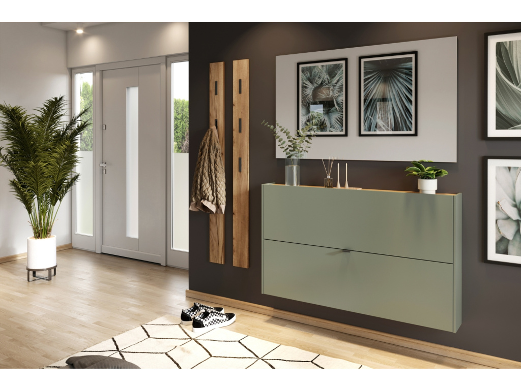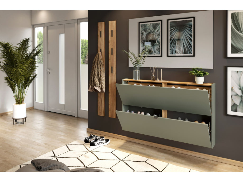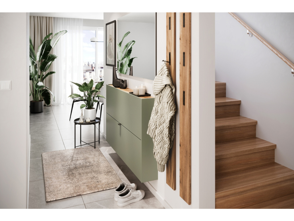 Botník Ameca od značky Germania je přesně ten prvek, který dokáže předsíň okamžitě povýšit na stylový a dokonale uspořádaný prostor. Elegantní kombinace zeleného dekoru s přírodním dubem Navarra vytváří harmonický celek, který působí moderně, svěže a zároveň příjemně hřejivě. Povrchová úprava z melaminové pryskyřice chrání korpus před poškrábáním a vlhkostí, zatímco kvalitní ABS hrany zaručují, že si botník zachová svůj vzhled po dlouhá léta. O pohodlné používání se stará tlumené dovírání dvířek, které zajistí tichý, plynulý chod bez zbytečného bouchání. Uvnitř najdete praktické kovové koše na boty, které udrží obuv přehledně uloženou, dobře odvětranou a vždy snadno dostupnou. Ameca je botník, který spojuje elegantní design, kvalitní zpracování a skutečnou funkčnost. Perfektní volba, pokud chcete mít vstupní prostor nejen krásný, ale i skvěle zorganizovaný.