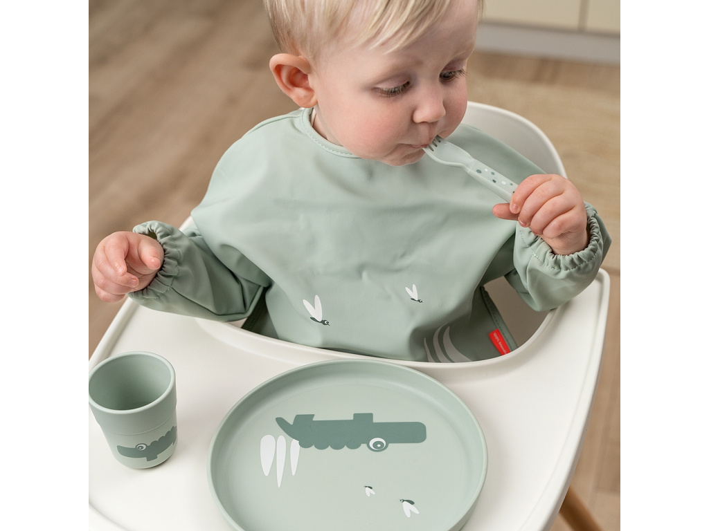 Praktický talíř od Done by Deer zaujme svým hravým vzhledem každého malého uličníka. Zelený krokodýl Croco bude doprovázet vaši ratolest, ať už bude právě svačit, obědvat či večeřet. Talíř je vyrobený z potravinářského plastu, a díky protiskluzovému TPE povrchu na spodní straně se nemusíte bát, že by ze stolu sklouzl. Vysoký okraj a kulaté hrany zase zajistí snadné nabírání jídla.