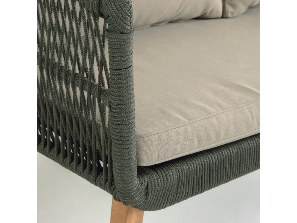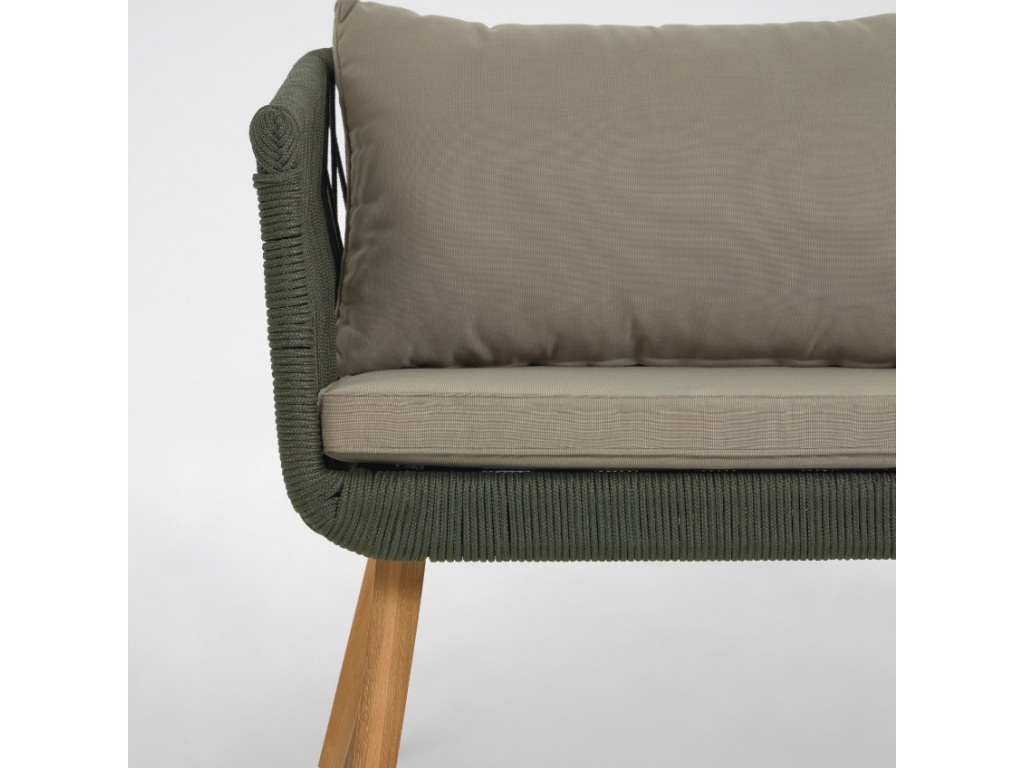 Krása zahradního setu Kave Home Inti vyobrazena v jeho zelené modré barvě. Zaujme vás především jednoduchost a elegance. Zelený výplet na hliníkovém rámu spolu s podnoží z akátového dřeva dělají z tohoto setu designový kousek. Jako doplněk jistě zaujme i příjemný měkký podsedák a polštáře, které je součástí balení. Díky tomuto setu budou chvíle na vaší zahradě či terase výjimečné.