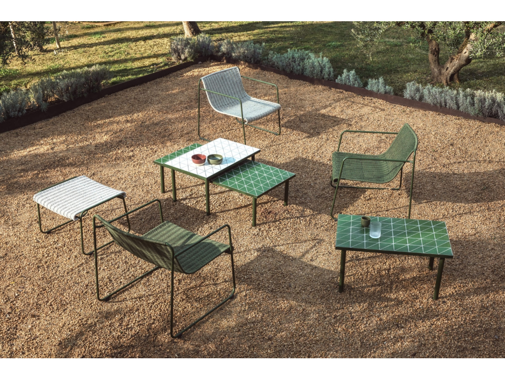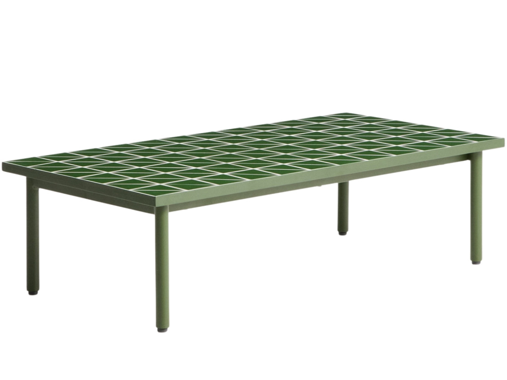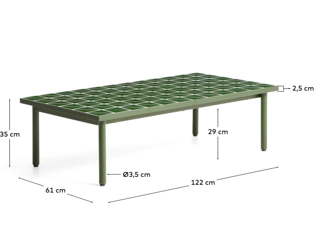 Zahradní konferenční stolek Maurina vnese do vašeho odpočinkového koutu sofistikovanou harmonii tradičního řemesla a moderního designu. Dominantním prvkem je jeho obdélníková deska s precizní zelenou mozaikou, která skládá hold středomořské estetice v osvěžujícím geometrickém pojetí. Subtilní podnož z pozinkované oceli v elegantním zeleném laku zajišťuje vysokou stabilitu a odolnost vůči povětrnostním vlivům, zatímco plastové chrániče nohou citlivě pečují o povrch vaší terasy i interiéru.