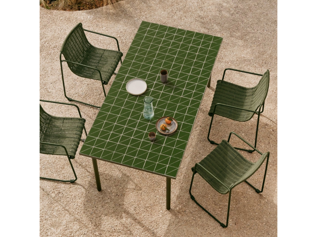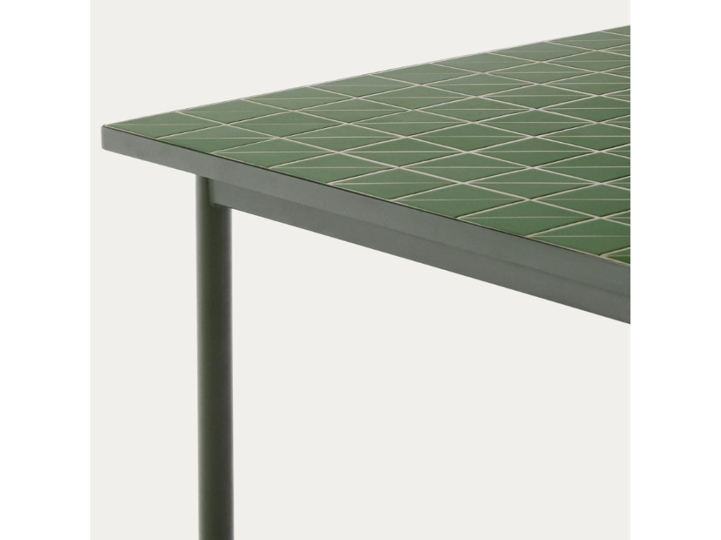 Zahradní stůl Maurina od značky Kave Home vnese na vaši terasu sofistikovanou harmonii tradičního řemesla a moderního designu. Hlavním prvkem je jeho mozaiková deska s geometrickým vzorem, která jakoby vzdávala hold středomořskému stylu. Naopak podnož z pozinkované oceli v elegantní zelené barvě je subtilní a jednoduchá, ale také stabilní a vysoce odolná vůči korozi a povětrnostním vlivům. Navíc díky plastovým chráničům chrání podlahu a umožňuje použití na terase, v zahradě i v interiéru. Stůl můžete dokonale sladit se zahradními židlemi ze stejnojmenné kolekce, ve které naleznete i další krásné designovky.
