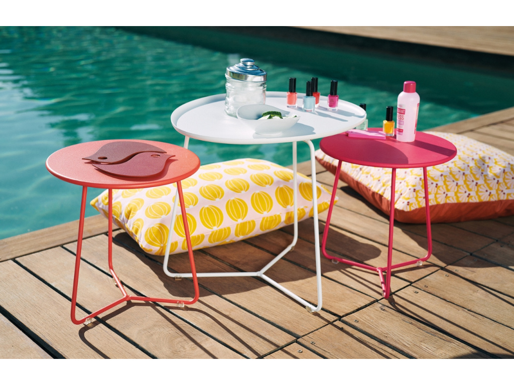 Celokovový odkládací stolek Fermob Cocotte je dostupný v široké škále barev Fermob, díky čemuž se může snadno stát stylovým kouskem nábytku ať už u bazénu, na terase nebo dokonce v obývacím pokoji. Má perfektní rozměry pro odložení nápoje a rozečtené knihy, ale také k umístění rostlin a designové venkovní lampy. Je vyráběn z prvotřídních materiálů a testován tak, aby splňoval standardy kvality evropských norem (NF EN 581-1 a NF EN 581-2). Exkluzivní systém antikorozní úpravy pro venkovní použití a anti-UV práškový lak (standardizované testy AFNOR) dělá ze stolku ideálního společníka.