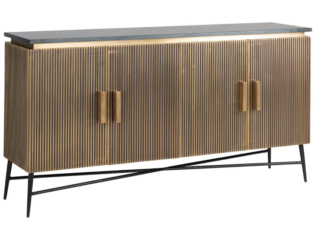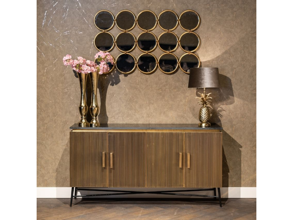 Designová komoda Ironville značky Richmond se stane ideálním společníkem ve vašem moderně zařízeném interiéru. Disponuje čtyřmi policemi ukrytými za čtyřmi dvířky. Komoda je vyrobena ze zlatě lakovaného kovu, přičemž vrchní desku tvoří černý mramor. V sérii Ironville najdete další produkty jako skříň nebo noční stolek, se kterými můžete vás interiér perfektně sladit.