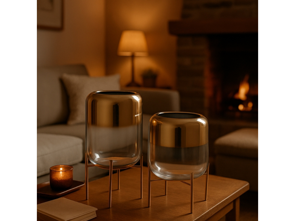 Skleněná váza J-line Oceanne zaujme kombinací zlaté a transparentní barvy. Interiér skvěle ozdobí a květinám dodá šmrnc. Její skleněné tělo stojí na podnoži z lakovaného kovu, díky které působí vzdušným a elegantním dojmem. Dostupná je ve dvou velikostech.