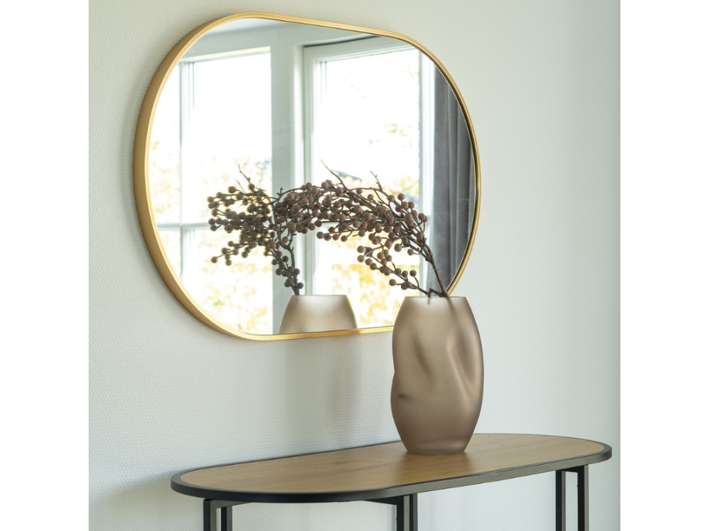 Stylové závěsné zrcadlo Zahrah od značky Nordic Living zaujme svým výrazným designem. Kovový rám ve zlaté barvě vnese do vašeho domova dotek osobité elegance a ozvláštní tím jakékoli zákoutí vašeho domova. Zrcadlo se snadno zavěsí a perfektně se hodí do moderních, ale i klasických interiérů.
