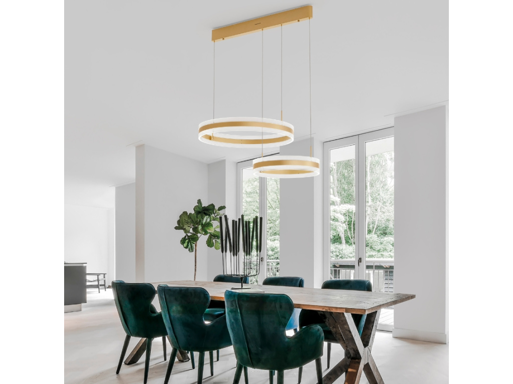 Kolekce stmívatelných závěsných LED světel Agos od značky Nova Luce představuje luxusní řešení pro velké a reprezentativní prostory. Design těchto svítidel tvoří elegantní zlaté kruhy, které lze díky závěsnému systému nastavit do různých výšek a vytvářet tak unikátní kompozice. Integrované LED zdroje nabízejí možnost stmívání, což umožňuje přizpůsobit intenzitu osvětlení dle aktuální potřeby. Svítidla z této kolekce se hodí do moderních interiérů, kde podtrhnou výjimečnost prostoru, například do hotelových lobby nebo luxusních obytných prostor. Kolekce Agos kombinuje špičkový design s maximální funkčností.