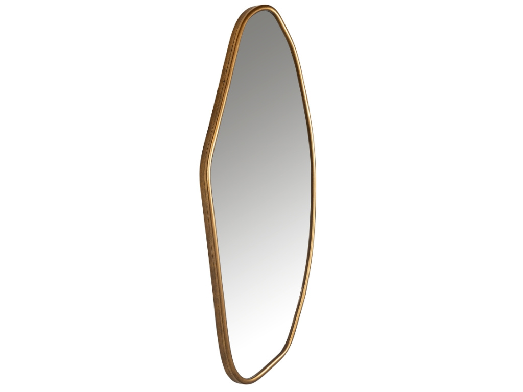Jedinečné závěsné zrcadlo Eldon zaujme svým zajímavým minimalistickým provedením. Nepravidelně tvarovaný rám ve zlaté barvě vnese do vašeho domova dotek osobité elegance. Bude se skvěle vyjímat nejen v klasických interiérech, ale také v těch moderních s nádechem skandinávského stylu. Své místo jistě najde u botníku v předsíni nebo u postele v ložnici. Vyšperkujte si domov!
