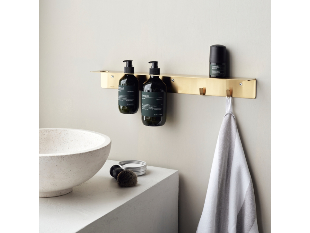 Nástěnný držák Supply od Meraki bude vaším pomocníkem v koupelně či v kuchyni. Bude se vám hodit k uskladnění vašich oblíbených krémů nebo mycích prostředků či k zavěšení utěrky a různých doplňků. Najdete na něm tři otvory na lahve Meraki a dva háčky. Supply je vyrobený z nerezové oceli s kartáčovaným mosazným povrchem, který nepropustí žádnou vodu. Držák bude stylovým doplňkem a zároveň pomůže udržovat pořádek.