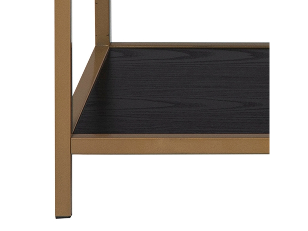 Moderní regál Darila vás zaujme svým minimalistickým designem. Celá konstrukce je ze zlatě lakovaného kovu. Police jsou z černého melaminu, který krásně kontrastuje s barvou kovu. Police jsou asymetricky rozmístěné a díky tomu nabízí různě velký úložný prostor pro váš inventář. Díky svému modernímu designu působí regál velmi vzdušně a odlehčeně. Darila stylově doplní každý moderně zařízený interiér.