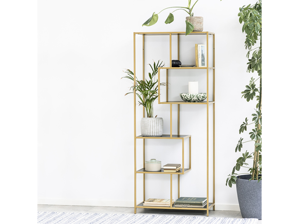 Moderní regál Darila vás zaujme svým minimalistickým designem. Celá konstrukce je ze zlatě lakovaného kovu. Police jsou z černého melaminu, který krásně kontrastuje s barvou kovu. Police jsou asymetricky rozmístěné a díky tomu nabízí různě velký úložný prostor pro váš inventář. Díky svému modernímu designu působí regál velmi vzdušně a odlehčeně. Darila stylově doplní každý moderně zařízený interiér.