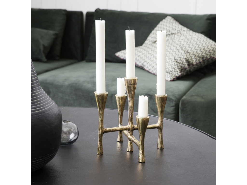 S tímto svícnem Tristy od značky House Doctor můžete rozzářit svůj domov a vdechnout příjemnou a útulnou atmosféru do vašeho domova. Zlatě lakovaný stojan z hliníku zaujme svým netypickým tvarem a rustikálním vzhledem. Dolaďte svůj sváteční večer tímto designovým kouskem, jistě se stane středem pozornosti. Hodí se na svíčky o průměru 2 cm.
