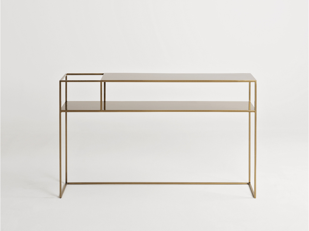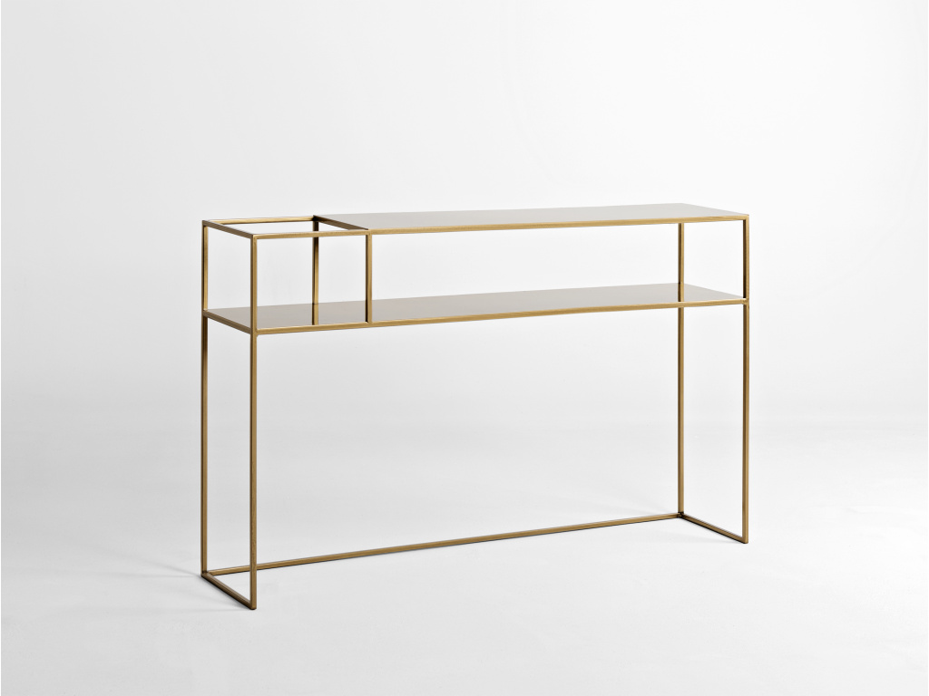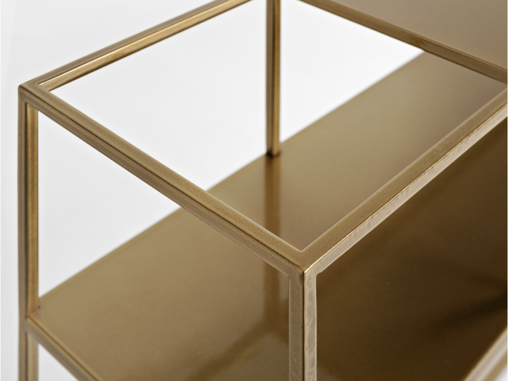Elegantní toaletní stolek Moreno zaujme svým minimalistickým vzhledem. Celokovové zpracování ve zlaté barvě dodává stolku patřičnou stabilitu a osobitý industriální styl. Díky průřezu můžete do stolku libovolně umístit květinu či cokoliv jiného a vytvořit tak designový prvek ve vašem interiéru. Dalším bonusem je praktická police, kam hravě uložíte váš drobný inventář. Stolek se skvěle hodí do moderních interiérů.