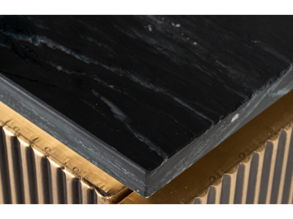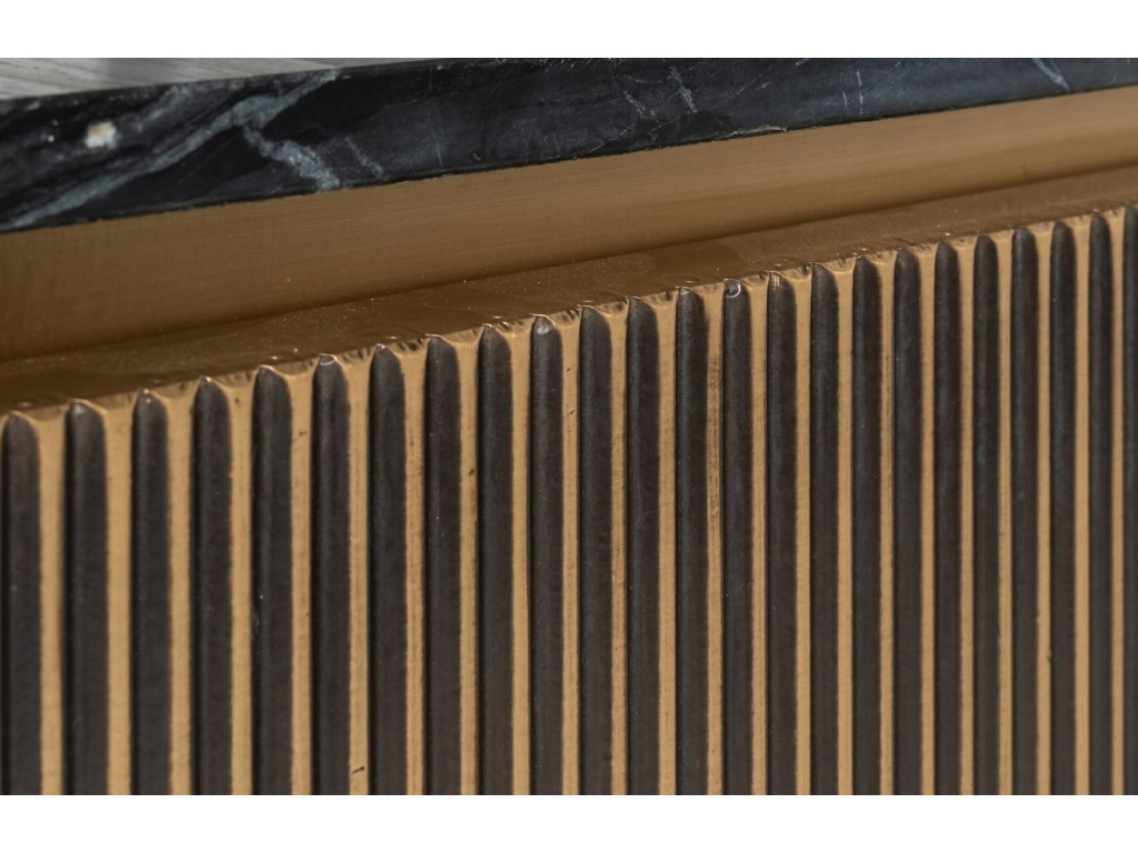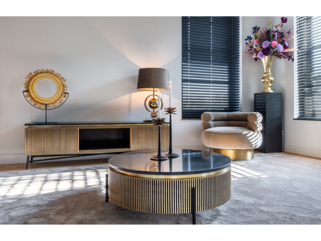 Zlatý TV stolek Ironville od značky Richmond Interiors zaujme svým osobitým zpracováním a kombinací materiálů. Deska stolku je vyrobena z černého mramoru, korpus ze zlatého kovu. Atraktivitu nábytku zvyšuje úložný prostor s jednou otevřenou policí a dvěma uzavíratelnými zásuvkami. Díky čistému provedení a stylovému designu se stolek Ironville stane dominantou vašeho interiéru.