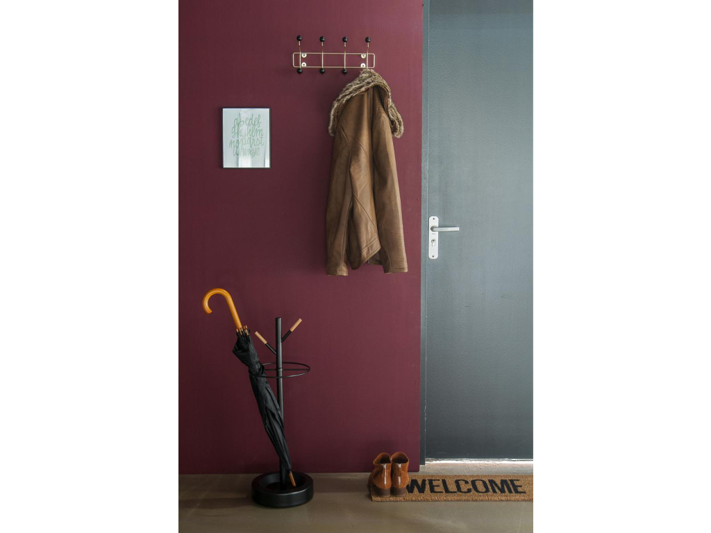 Designový nástěnný věšák Arfus II. ve zlatém provedení, kde jsou na místo klasických háčků použity černé kuličky. Díky několika barevným kombinacím je široká možnost umístění. Například do předsíně, ložnice, haly i dětského pokoje.