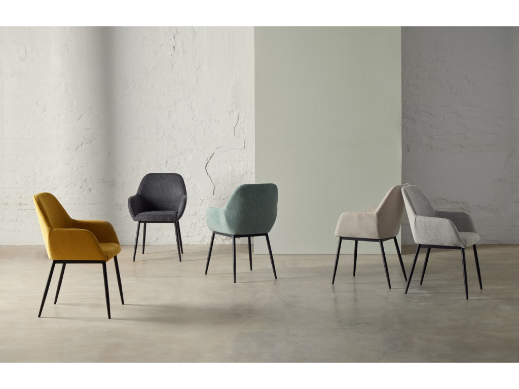 Elegance a funkčnost – to je čalouněná jídelní židle Isabella od španělské značky Somcasa. Měkké čalounění je příjemné na dotek a polyuretanová pěna ve výplni zajišťuje maximální pohodlí, ať už budete sedět u jídelního nebo pracovního stolu. Stabilitu židle zajišťuje štíhlá kovová podnož s povrchovou úpravou v černém matném laku, která doplňuje celkový design. Židli si oblíbíte i díky jejímu jednoduchému vzhledu, který se hodí jak do klasických, tak i do moderně a skandinávsky laděných interiérů.