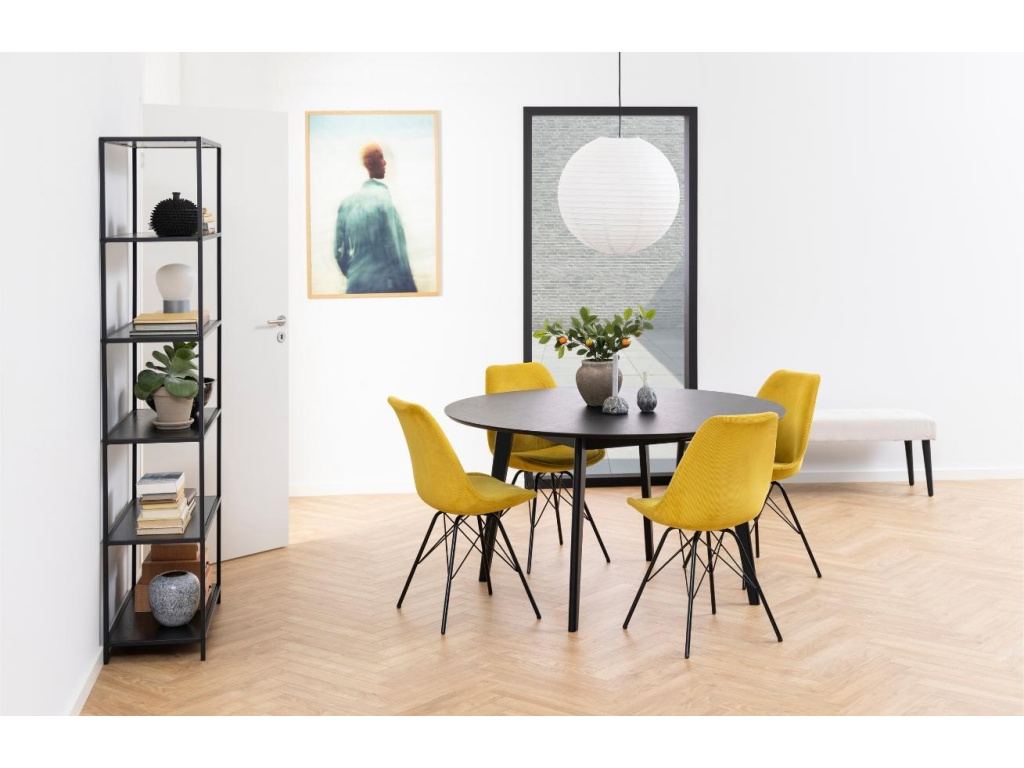 Elegantní a stylová jídelní židle Erisa bude krásným a pohodlným doplňkem vaší jídelny. Zajímavě řešená podnož je vyrobená z černě lakovaného kovu a díky tenkým liniím působí lehce a elegantně. Pohodlný tvarovaný sedák a zádová opěrka je čalouněná žlutou manšestrovou látkou, která židli dodá komfort a styl. Židle Erisa se hodí do moderních jídelen.
