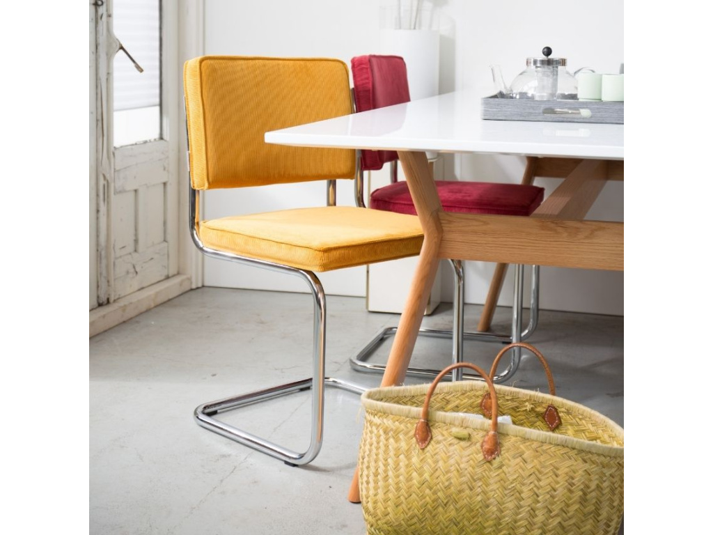 Jídelní židle ZUIVER RIDGE RIB vám dopřeje klasický nostalgický pocit podmíněný sedákem a opěradlem z žebrované tkaniny, tzv. epinglu. Lesklý chromovaný rám poskytuje elegantní vzhled a především zajišťuje perfektní stabilitu celé židle. Na spodní části rámu jsou navíc připevněné čtyři plastové kluzáky chránící vaší podlahu před poškrábáním.
