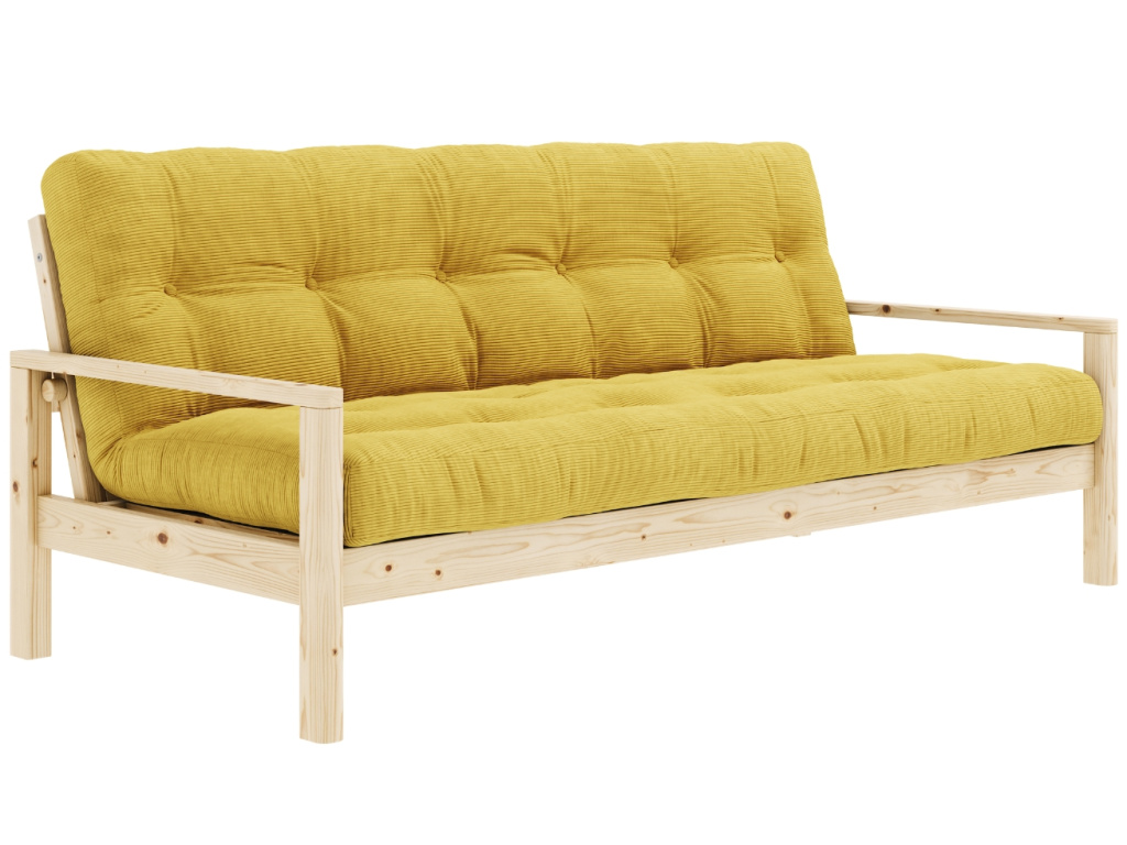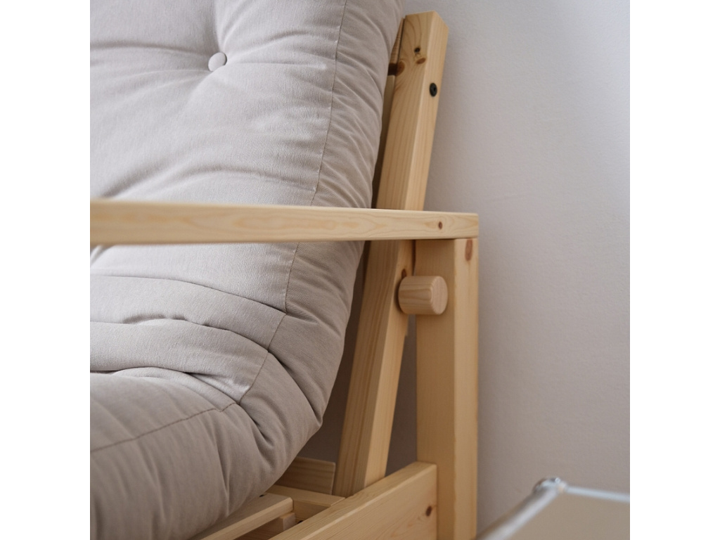 Pohovka nebo postel? Trojmístná rozkládací pohovka Knob od dánské značky Karup Design umí být obojím! Pod dřevěnými područkami se nachází dva nenápadné úchyty, které lze snadno odšroubovat a vy tak během chvilky získáte pohodlné lůžko pro vás nebo vaše hosty. Konstrukce z masivního borovicového dřeva s FSC certifikací je doplněna kvalitní 14cm futonovou matraci, která v sobě kombinuje recyklovaná vlákna a 4 cm pěny. Pohovka Knob fantasticky zapadne do skandinávských a japonských stylů interiérů, do kterých vnese jednoduchost, eleganci a ryzí funkčnost. Představuje skvělé řešení zejména pro menší prostory, do kterých přinese další místo na spaní. Vybrat si ji můžete v další barvě konstrukce či v mnoha barvách matrací.