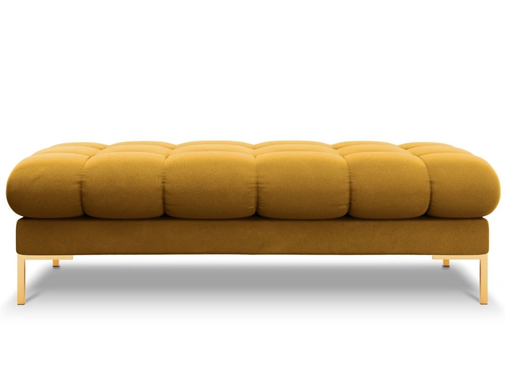 Elegantní lavice Micadoni Mamaia zaujme na první pohled svým nadýchaným vzhledem. Velmi příjemné sametové čalounění a zlatá podnož vytváří kontrast, který interiéru dodá elegantní vzhled a nádech luxusu. Díky zajímavému prošívání vzniká jemný design, který do vašeho domova vnese lehkost a styl. Nechte se obklopit komfortem ve společnosti produktů Mamaia.