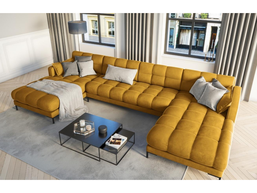 Elegantní šestimístná rohová pohovka MICADONI MAMAIA zaujme na první pohled svým nadýchaným vzhledem. Velmi příjemné sametové čalounění ve žluté barvě a kovová podnož vytváří kontrast, který interiéru dodá elegantní vzhled a nádech luxusu. Díky zajímavému prošívání vzniká jemný design, který do vašeho domova vnese lehkost a styl. Opěrné polštářky zvednou úroveň vašeho odpočinku o stupeň výš. Díky praktickému tvaru do písmene U získáte rovnoměrně rozdělená místa k odpočinku. Nechte se obklopit komfortem ve společnosti produktů Mamaia.