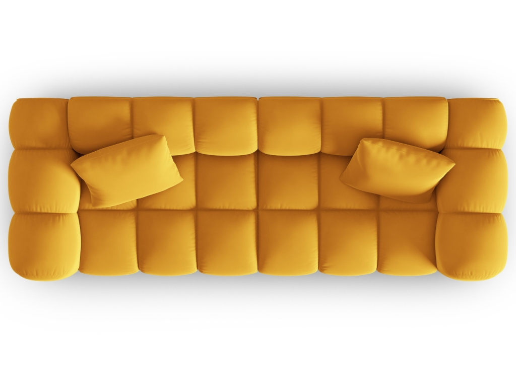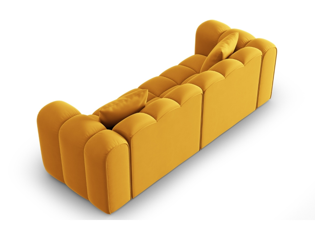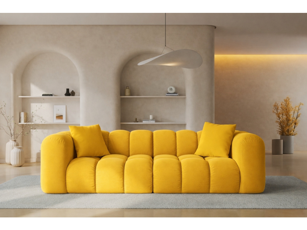 Velkolepá třímístná pohovka Halley od značky Windsor & Co zaujme charakteristickým prošíváním. Bublinkové sedáky, opěradla a područky vybízejí k nespoutané relaxaci. Pohovka je čalouněná sametovou látkou s jemným leskem ve žlutém provedení, která je měkká a velice příjemná na dotek. Tkanina je velmi odolná proti oděru a absorpci tekutin, čímž zaručí dlouhodobé používání bez známek opotřebení. Látka navíc prošla cigaretovým testem, tudíž je odolná proti doutnání a vznícení. Tento skvostný kus nábytku nejen zaujme na první pohled, ale především zútulní váš interiér ve skandinávském nebo glamour stylu. Příjemným bonusem jsou elegantní polštářky, které doladí pohovku k dokonalosti. Pro sjednocení vašeho sedacího koutu doporučujeme pohovku doplnit také o podnožkou ze stejnojmenné série. Všechny produkty nabízíme v několika barvách. Odpočiňte si a relaxujte ve stylu!