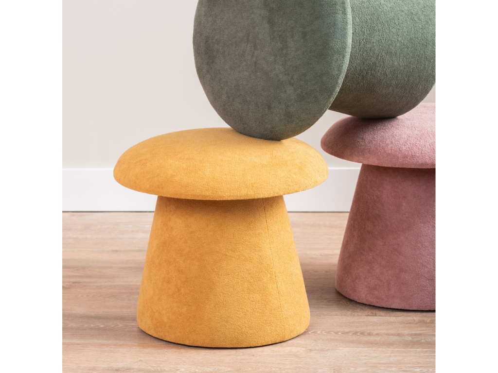 Hledáte způsob, jak oživit svůj interiér něčím jedinečným? Taburet Froom je perfektním způsobem, jak přidat do vašeho prostoru svěží doplněk. Jeho tvar připomínající hříbek z něj činí roztomilý a hravý prvek, který si vaše děti okamžitě zamilují. Sametové čalounění ve žluté barvě dodává taburetu elegantní vzhled a zajišťuje měkké a pohodlné posezení. Díky jeho kompaktním rozměrům je snadné ho přenášet a umístit podle potřeby. Ať už ho umístíte do dětského pokoje, obývacího pokoje nebo pokoje pro hosty, Froom skvěle zapadne do jakéhokoli interiéru a dodá mu jedinečný styl.