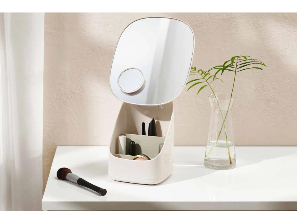Stolní kosmetické zrcátko s organizérem na kosmetiku Viva bude skvělým společníkem při líčení. Velké oválné zrcátko slouží zároveň jako víko pro praktický úložný prostor na kosmetiku. Zrcátko je s organizérem spojeno kloubem, umožňujícím po odklopení přístup ke kosmetice a zároveň snadné nastavení optimálního úhlu. Hlavní velké oválné zrcátko je doplněno malým kompaktním magnetickým zvětšovacím zrcátkem (3x) pro zobrazení detailů. Malé zrcátko lze držet v ruce nebo magneticky uchytit na plochu velkého zrcátka. Úložný prostor na kosmetiku je vybaven vnitřní odnímatelnou přepážkou, kterou lze v případě potřeby snadno vyčistit. Organizér je doplněn protiskluzovou základnou.